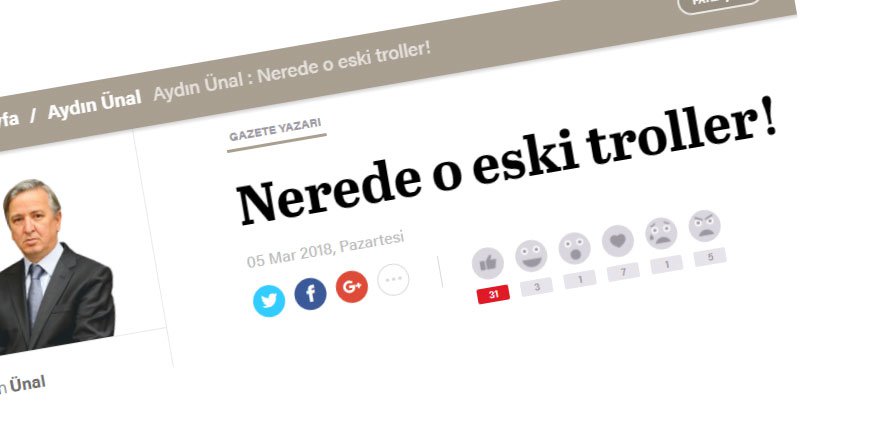 Yazısında Türkiye’de “trol” kavramının oluşumu ve anlamını mercek altına alan Aydın Ünal, “Şimdinin trolleri parayla çalışan müzik kutularına, paralı askerlere, lejyonerlere benziyorlar.” diyor.