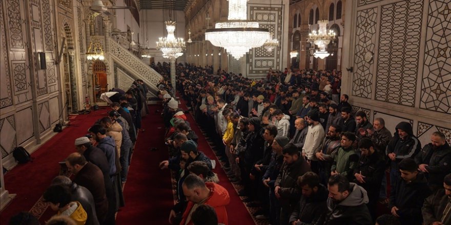 Suriye'de Baas rejiminin devrilmesinin ardından yüzlerce Suriyeli, başkent Şam'daki Emevi Camisi'nde ilk teravih namazında saf tuttu.