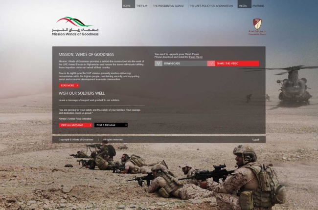 Sağ üst tarafta Başkanlık Muhafızlarının amblemi, biraz altında bir Black Hawk helikopteri görülebiliyor. Solda büyük fontla "Hayır Rüzgarları Görevi" yazılı. Bu, BAE’nin Afganistan’da yürüttüğü operasyonun adı.