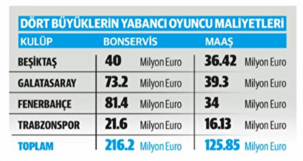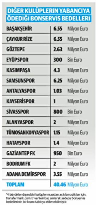 SÜPER LİG'DEKİ 19 KULÜBÜN TAKIMDAKİ YABANCILARA ÖDEDİĞİ BONSERVİS BEDELİ 256 MİLYON EURO