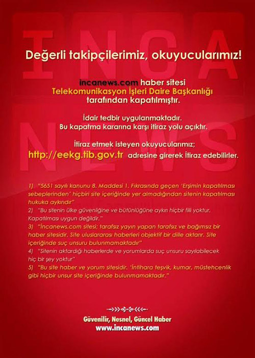 Küresel çatışmaların; finansal, siyasi ve sosyolojik analizlerini ortaya koyan haber portalı ‘incanews.com’ Telekomünikasyon işleri daire başkanlığı tarafından kapatıldı. İncanews sitesinin yanında bağlı bulunan sosyal medya hesapları da önceden herhangi bir bildirimde bulunulmadan kapatıldı.