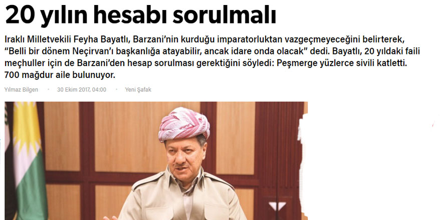 Irak Kürdistanında gerçekleştirilen bağımsızlık referandumu sonrası Mesut Barzani karşıtlığı üzerinden eteklerindeki ırkçı, milliyetçi, faşizan taşları döken kişi ve medya organları galiba Barzani Savaş Suçları Mahkemesi’nde yargılanmadan rahat etmeyecek!