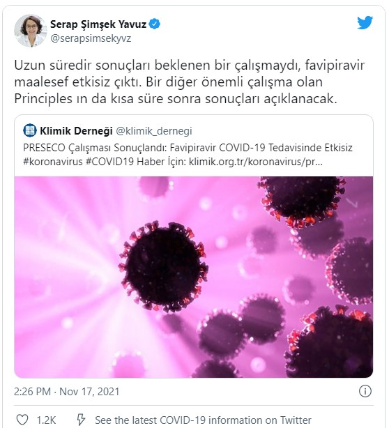 Türk Klinik Mikrobiyoloji ve İnfeksiyon Hastalıkları Derneği (KLİMİK), salgının başından beri kullanılan favipiravir ilacının yapılan bir çalışmaya göre etkisiz olduğunu duyurdu.