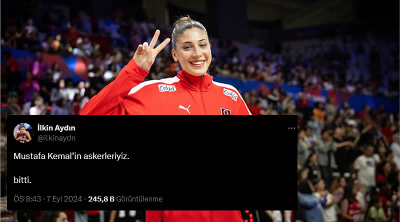 Recep Tayyip Erdoğan’ın “Bu kılıçları kime çekiyorsunuz?” sözlerine yanıt “Kemalizmin kızları” olarak kamuoyunda büyütülen voleybolculardan birinden geldi. Galatasaray voleybolcusu İlkin Aydın sosyal medyada “Mustafa Kemal’in askerleriyiz, bitti” paylaşımını yaptı.