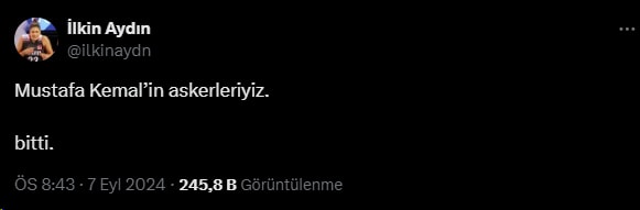 İlkin Aydın X platformunda “Mustafa Kemal’in askerleyiz, bitti” paylaşımını yaptı. “Atatürk’ün kızlarını” her konuda tetikçi olarak kullanan Kemalistler bu paylaşımı hemen manşetten verdiler.