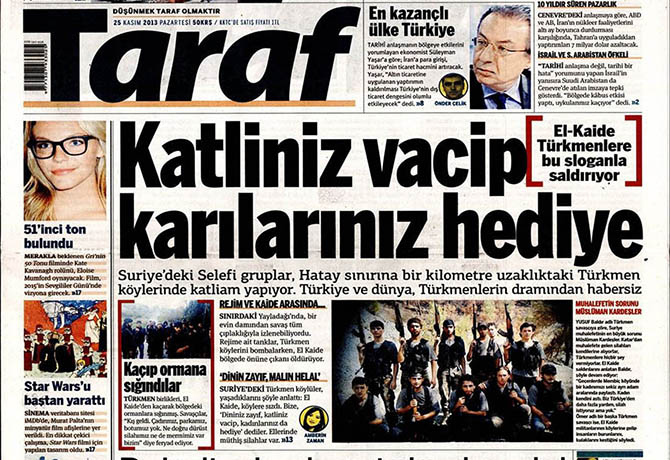 Birçok kez Suriye direnişini karalamayı amaçlayan manşetle çıkan Taraf, “Selefiler Türkmenleri öldürüp karılarını da hediye alıyor!” diyerek kara propaganda aygıtı gibi çalıştığını bir kez daha kanıtlıyor.