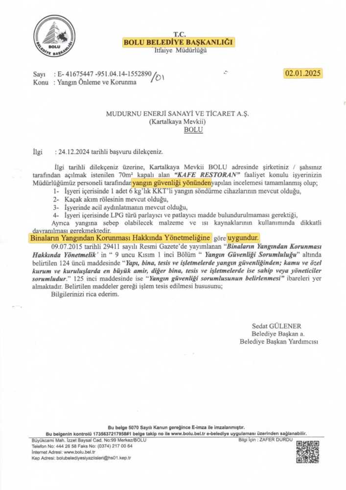 "Kartalkaya mevkii Bolu adresinde şirketiniz şahsınız tarafından açılmak istenilen 70m2 kapalı alan "Kafe restoran" faaliyet konulu iş yerinizin Müdürlüğümüz personeli tarafından yangın güvenliği yönünden yapılan incelemesi tamamlanmış olup; iş yeri içerisinde 1 adet 6 kg'lik KKT'li yangın söndürme cihazlarının mevcut olduğu, kaçak akım rölesinin mevcut olduğu, iş yerinde acil aydınlatmanın mevcut olduğu, işyeri içerisinde LPG türü parlayıcı ve patlayıcı madde bulundurulmaması gerektiği ayrıca yangına sebep olabilecek malzeme ve ısı kaynaklarının kullanımında dikkatli davranılması gerekmektedir."