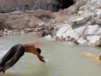 Halep'te park alanlarını kaybeden çocuklar, Rus bombardımanlarının açtığı derin çukurlara biriken sularda oynuyor.