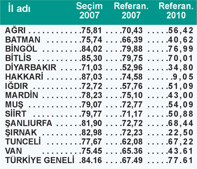 Seçim istatistiklerini çok iyi izleyen Sayın Erol Tuncer’den rica ettim. 2007 seçimleri, 2007 referandumu ve son 2010 referandumundaki katılma oranlarını gönderdi. 2007 seçimlerinde DTP’nin sıralamada birinci veya ikinci olduğu 14 ildeki seçime katılma oranları şöyle: