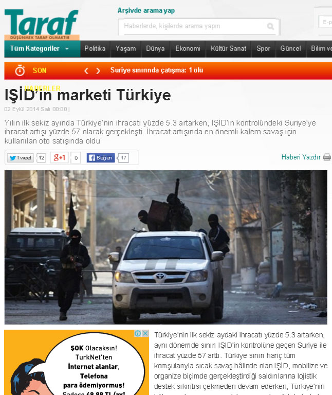 “…Yılın ilk sekiz ayında Türkiye’nin ihracatı yüzde 5.3 artarken, IŞİD’in kontrolündeki Suriye’ye ihracat artışı yüzde 57 olarak gerçekleşti. İhracat artışında en önemli kalem savaş için kullanılan oto satışında oldu.”