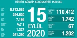 Türkiye'de son 24 saatte 110 bin 412 Kovid-19 testi yapıldı, 1742 kişiye hastalık tanısı konuldu. Son 24 saatte 67 kişi Kovid-19 nedeniyle hayatını kaybetti, 1327 ağır hasta sayısı oldu.