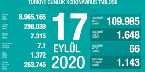 Türkiye'de son 24 saatte 109 bin 985 Kovid-19 testi yapıldı, 1648 kişiye hastalık tanısı konuldu. Son 24 saatte 66 kişi Kovid-19 nedeniyle hayatını kaybetti, ağır hasta sayısı 1372 oldu.