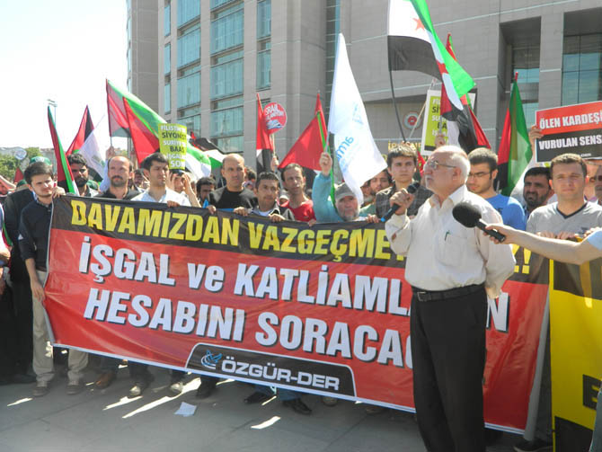 “Filistin’de Siyonist, Suriye’de Baas İşgaline Son!”, “Kahrolsun İsrail!”, “Filistin Özgür Oluncaya Dek!”, “İsrail İçin Hesap Vakti”, “İsrail Yargılanıyor!”, “Ölen Kardeşin Vurulan Sensin!”, “İsrael Under The Blockage of Justice!” yazılı dövizlerin taşındığı eylemde “Yaşasın Küresel İntifada!”, “Katil İsrail Hesap Verecek!”, “Birruh Biddem Nefdike Ya Aksa!”, “Mavi Marmara Onurumuzdur!”, “Ya Allah Menna Ğayrek Ya Allah!” sloganları atıldı.