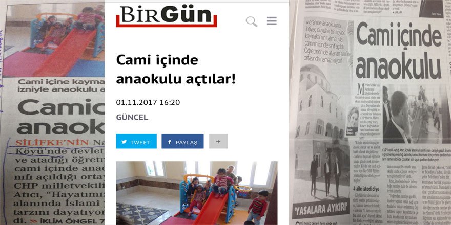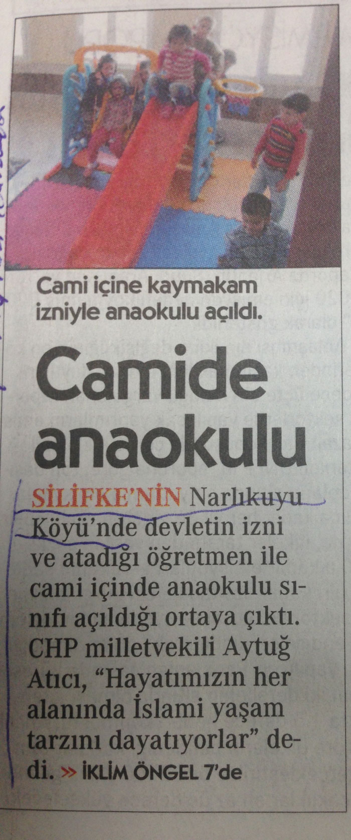 Silifke’nin Narlıkuyu Köyü’nde zorunluluktan ötürü, velilerin verdikleri dilekçeler sayesinde devletin izni ve atadığı öğretmen ile cami içinde anaokulu sınıfı açılması üzerine durumdan vazife çıkaran Cumhuriyet, Birgün gazeteleri ve CHP milletvekili Aytuğ Atıcı kendi tabiriyle "aldıkları bir ihbar üzerine“ bölgeye intikal etmişler!
