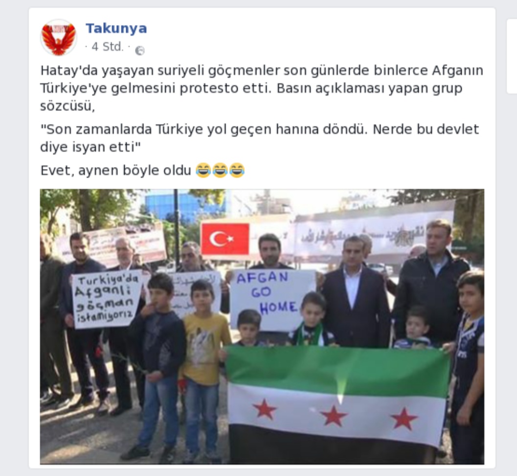 Fotoğrafta, Suriyeli mülteciler, ellerine aldıkları sözde Türkçe ve İngilizce dövizlerde Afganlıları Türkiye’de istemediklerini belirtiyorlar. Oysa fotoğrafın montaj olduğunu Teyit.org’dan Gülin Çavuş uzun bir süre önce ortaya çıkarmış ve gerçek fotoğraf da paylaşıma girmişti.