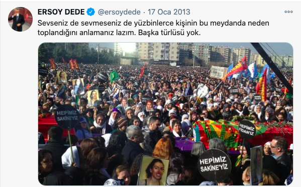 Paris’te aralarında PKK’nın kurucularından Sakine Cansız’ın da bulunduğu üç kadının öldürülmesini Başbakan Erdoğan “provokasyon veya iç infaz” olarak yorumladı. Yardımcısı Bülent Arınç “üzüntülerimi ifade ediyorum” dedi. Hükümete yakın medya, cinayetleri Çözüm Sürecine karşı ‘pusu’ ve ‘sabotaj’ diye niteledi. Akıllarda ise dönemin CHP İstanbul İl Başkanvekilinin attığı ve yıllar sonra ona bir buçuk yıl hapis olarak dönen bir tweet kaldı.