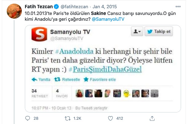 Fatih Tezcan ise cinayetten iki yıl sonra Twitter’da “10.01.2013’te Paris’te öldürülen Sakine Cansız barışı savunuyordu” demişti.