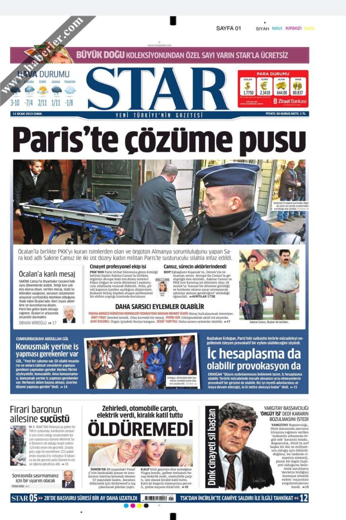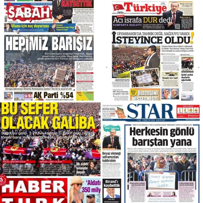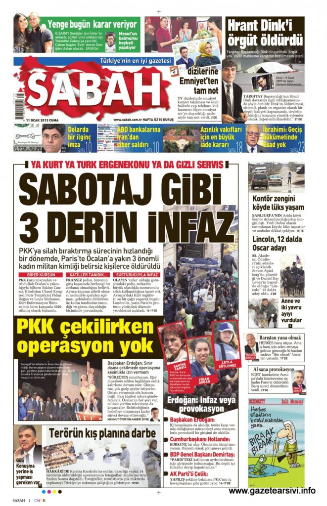 Hükümete yakın Star gazetesi, üç PKK’lı kadının öldürülmesini “Paris’te çözüme pusu” başlığıyla verirken, Sabah’ın manşetinde “Sabotaj gibi üç derin infaz” ifadesi yer alıyordu: