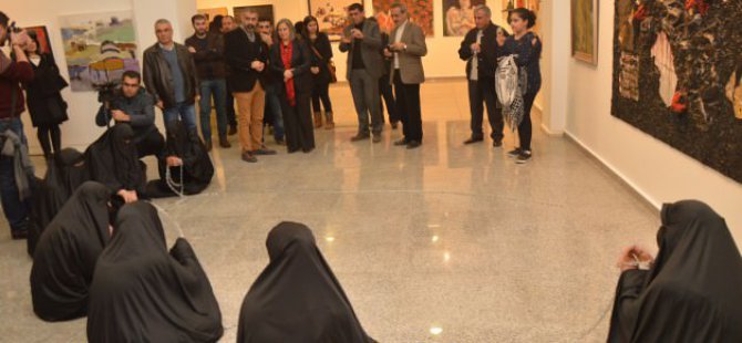 Kışanak'ın eserleri incelediği sırada çarşaf giydirilen veya çarşaflı olan altı kadının zincir vurularak galerinin ortasında "sanatseverlerin" beğenisine sunulduğu görüldü.