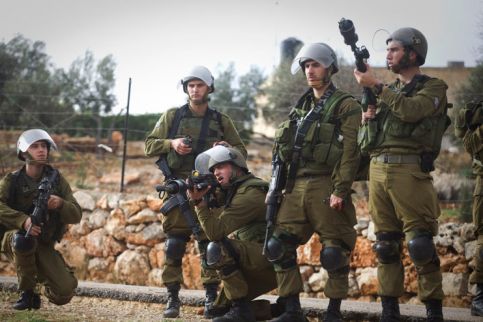 Cevahir Abu Rahmah'ın öldürüldüğü 31 Aralık günü, İsrail askerleri, Bilin'deki göstericilere göz yaşartıcı bombalar ve plâstik kaplı çelik mermilerle hücum ediyorlar. (Oren Ziv/ActiveStills)