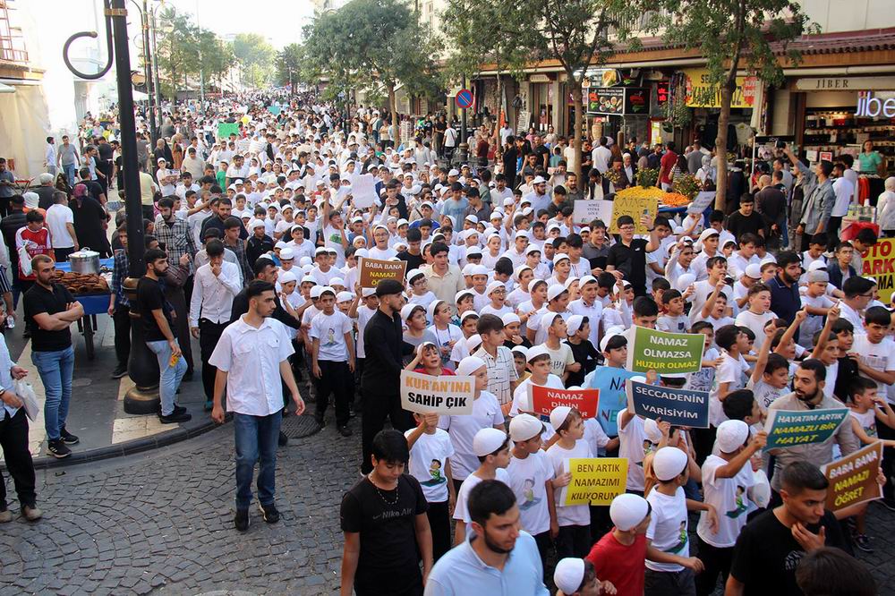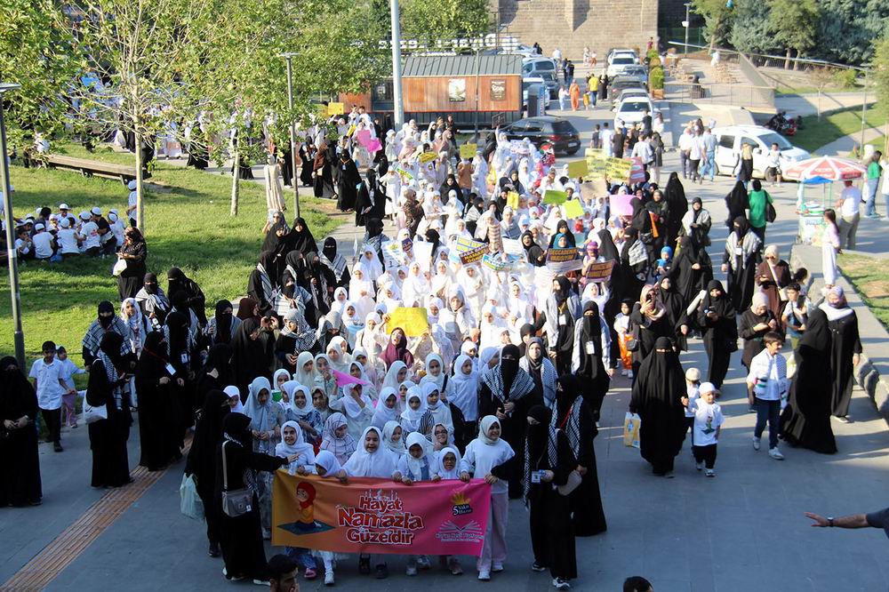 Ulu Camii'nde kılınan şükür namazının ardından programın yapılacağı Kurşunlu Camii'ne doğru yürüyüşe geçen çocuklar, "Hayat namazla güzeldir, Namaz dinin direğidir, Anne bana namazı öğret, Namazsız hayat olmaz" slogan ve dövizlerle Sur ilçesi caddelerine farklı bir renk kattı.