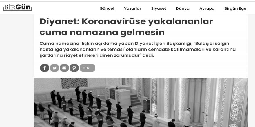 Din İşleri Yüksek Kurulu, "Koronavirüs görülen ülkelerde yüksek risk grubundaki Müslümanlar, cuma namazı yerine evlerinde öğle namazı kılabilir." açıklaması yaptı.