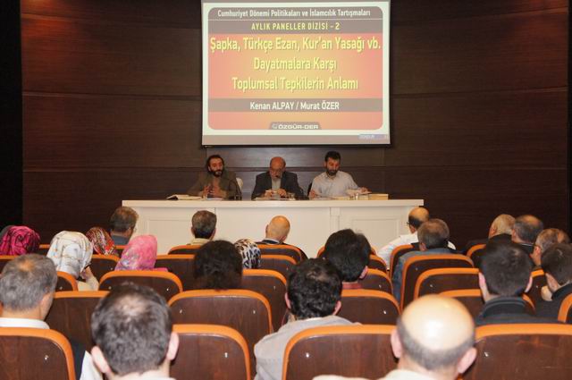 Özgür-Der, aylık panel dizisinin ikincisini “Şapka, Türkçe Ezan, Kur'an Yasağı vb. Dayatmalara Karşı Tepkilerin Anlamı” başlığı ile gerçekleştirdi. Oturum başkanlığını Rıdvan Kaya’nın yaptığı panelin konuşmacıları Kenan Alpay ve Murat Özer’di.