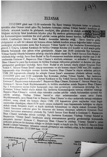 İliç Jandarma Bölük Komutanı Yılmaz Sandal, Jandarma Kıdemli Üstçavuş Lokman Karakaya ve Cumhuriyet Savcısı Eren Budak'ın altında imzası bulunan tutanağa göre, 22 Aralık 2009'da Ortatepe'de çobanlık yapan bir kişi, Sandal'ı arayarak ülke gündemi ile ilgili önemli bilgiler anlatacağını belirterek görüşmek istedi. Sandal, beraberinde bir üstçavuşla muhbirin evinde görüştü. Konuyla ilgili savcı Eren Budak'a bilgi verdi. Budak da konuyu Erzincan Başsavcısı Cihaner'e aktardı. Budak ve Sandal ile Erzincan'da yüz yüze görüşen Cihaner, ihbarcının anlattıklarının örgüt suçuna değil, ateşli silahla yasaya muhalefet kapsamına girdiğini söyledi. Cihaner ayrıca, Budak'a olayla ilgili Erzurum Özel Yetkili Savcısı'nın yetkisine giren bir durumun olmadığını ifade ederek savcının aranmamasını istedi. İliç Cumhuriyet Başsavcılığı'nın olayla ilgili hazırladığı fezlekede, 'silahlı terör örgütüne üye olma', 'tehlikeli maddeleri izinsiz bulundurma' şeklinde belirtilen suçun 1993-2009 yıllarını kapsadığı belirtiliyor. Fezlekeye göre, 1993'te İliç'e bağlı Bağıştaş istasyonuna bir asker çuvallarla mühimmat getirdi. Bunların Alevi-Sünni çatışmasında köylülerin kendilerini korumaları için gönderildiğini söyledi. Mühimmat, fezlekede adı şüpheli olarak geçen Ortatepe köyünde oturan Ömer Kuruçaylı tarafından koruculara dağıtıldı. Daha sonra başka bir şüpheli tarafından köye yakın bir mağaraya saklandı. Şüphelilerin hepsi mühimmatın Erzincan'ın Tercan ilçesinde görevli astsubay N.Ö. tarafından gönderildiğini aktardı. Kemaliye'ye bağlı Karakoçlu köyünde ikamet eden Bedir Büyüközkan da mühimmatın evinin altında iki çuval içinde saklandığını itiraf etti. Evdeki aramada 3 LAW, 3 tüfek bombası, iki el bombası, 27 mavzer mermisi ele geçirildi.