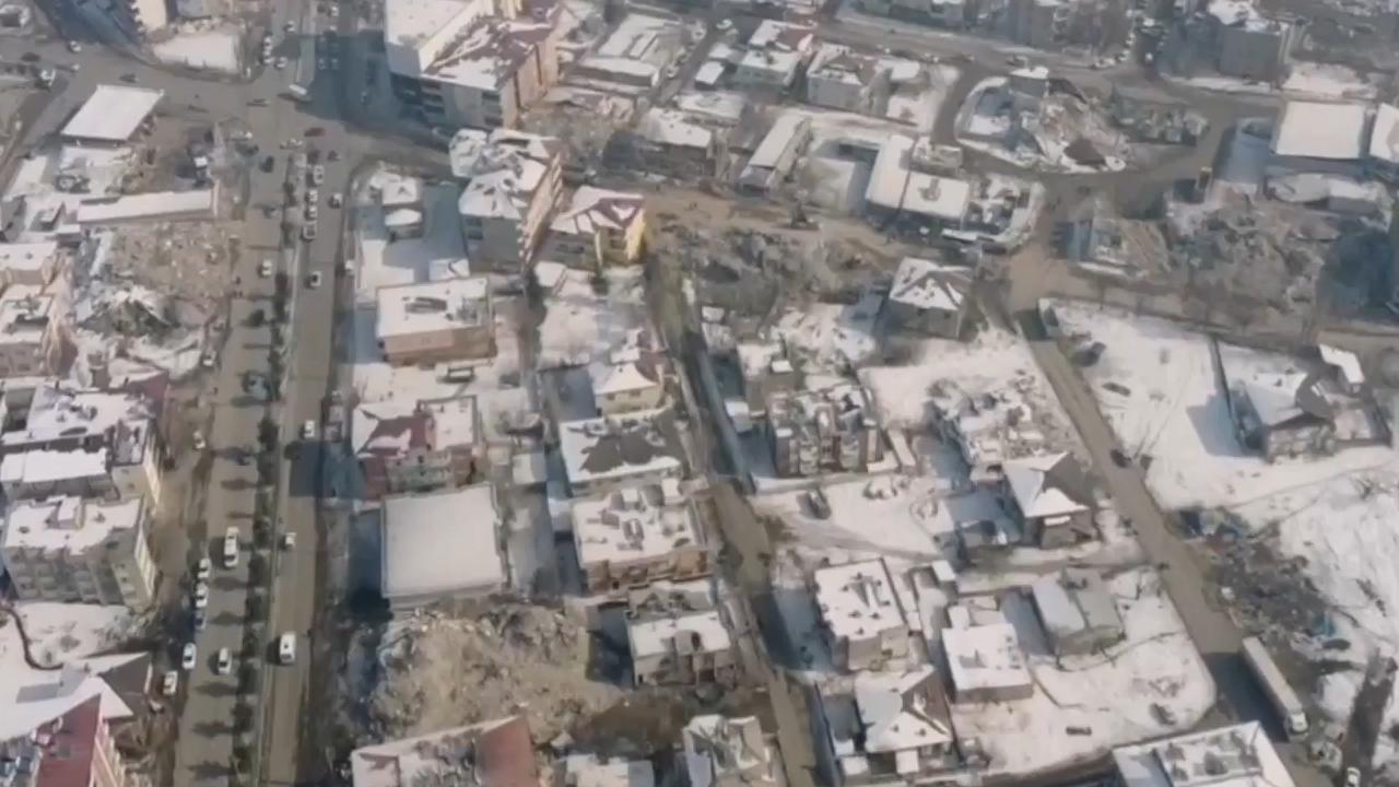 Merkez üssü Kahramanmaraş'ın Pazarcık ve Elbistan ilçeleri olan, Akdeniz, Doğu ve Güneydoğu Anadolu bölgelerindeki 10 ili etkileyen 7,7 ve 7,6 büyüklüğündeki depremin ardından Elbistan ilçesi dron ile havadan görüntülendi.