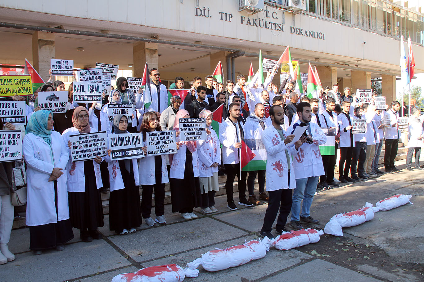 İşgal rejiminin hiçbir hak hukuk tanımadan hastaneleri bombalamaları, hasta ve hasta yakınlarıyla beraber hastanelerdeki sağlık çalışanlarının hayatını riske atmasını kınayan Dicle Üniversitesi tıp fakültesi öğrencileri, giydikleri kanlı önlük ve kefenli bebek maketleriyle Gazzeli meslektaşlarına desteklerini ifade etti.