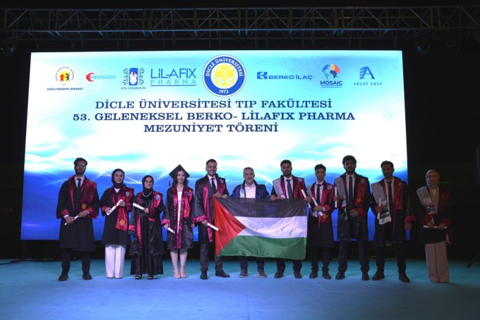 Törende konuşan Dicle Üniversitesi Rektörü, Fakülte Dekanı ve Tıp Öğrenci Ofisi Başkanı, Filistin halkının maruz kaldığı zulme dikkat çekerek öğrencilerin duyarlılığını selamladılar. Filistinli mezunlardan Malek Khazne, diploma almaya çıktığında Filistin bayrağını açarak salondan büyük alkış ve destek aldı. Bu an, hem duygusal hem de tarihi bir kare olarak hafızalara kazındı.