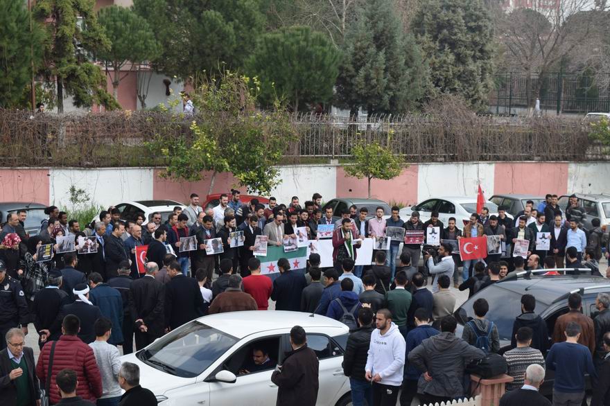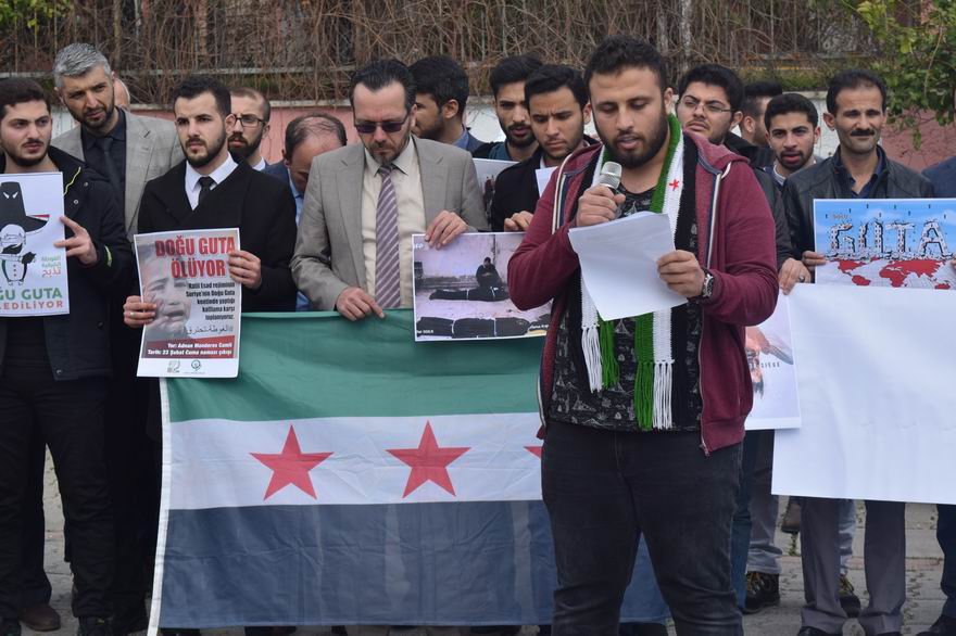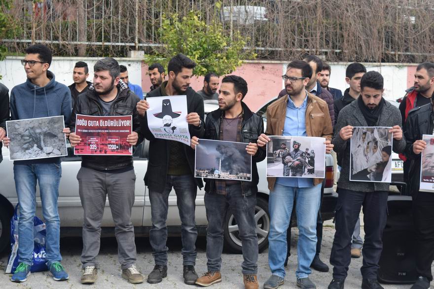 Adnan Menderes Üniversitesi (ADÜ) Suriye Öğrenci Birliği ve Genç İHH Aydın temsilciliği öncülüğünde kampüste toplanan topluluk, Doğu Guta'da saldırıda ölen çocukların fotoğraflarını taşıdı, "Suriye halkı yalnız değildir" ve "Katil Esed" sloganları attı.