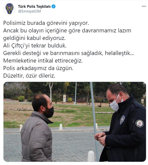 Yaşanan üzücü hadise sonrası Emniyet Genel Müdürlüğü bir tweet atarak yaşanan olayın doğru olmadığını ve vatandaşa ulaşılarak kendisinden helallik alındığını ifade etti.
