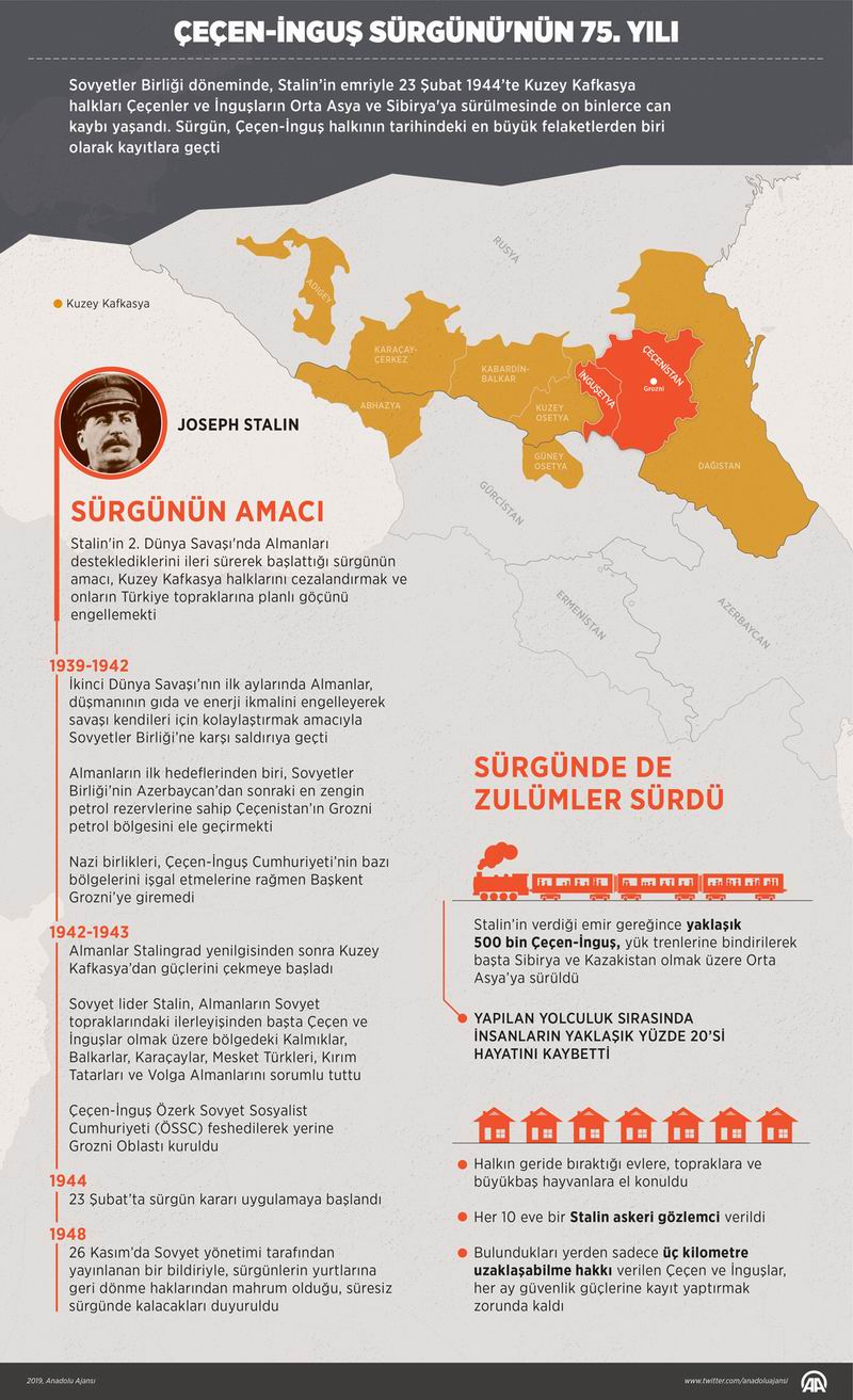 Stalin’in verdiği emir gereğince yaklaşık 500 bin Çeçen-İnguş, yük trenlerine bindirilerek başta Sibirya ve Kazakistan olmak üzere Orta Asya’ya sürüldü. Yalnızca 2 bin kişi dağlara kaçabildi.