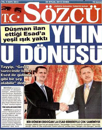 Cumhuriyet gazetesi bugün “Esed yine Esad mı oluyor?” manşetiyle çıkarken; Sözcü konuyu “Yılın U Dönüşü” (Düşman ilan ettiği Esad’a yeşil ışık yaktı) başlığıyla manşete çekti. Zaman gazetesi de yine birinci sayfadan sanki nötr ifadeler aktarıyormuş gibi; “Esedli geçiş olabilir” başlığını tercih etti. Zaman’ın diğerlerinden farkı içerikte sözlerin devamının yer almasıydı.