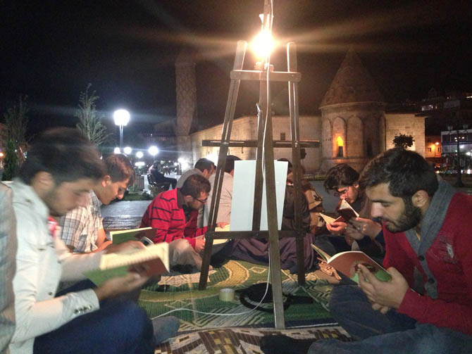 Lalapaşa Camii avlusunda bir araya gelen Erzurumlu Müslümanlar Cumartesi günü sabah namazına kadar çeşitli etkinliklerle oturma eylemlerini sürdüreceklerini açıkladılar.