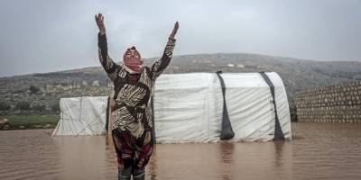 İdlib'de yoğun yağışlardan dolayı çadırları sel bastı. Birçok Suriyelinin derme çatma kurduğu çadırlar zarar görürken Suriye'yi yakıp yıkan Esed'e burada yaşamak seninle yaşamaktan iyidir mesajları ile lanetler okundu.
