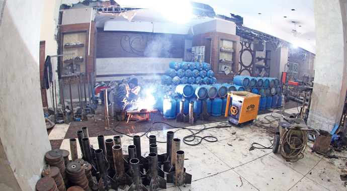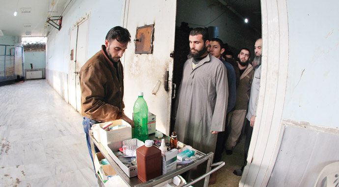 Envai çeşit silahın arasına yerleştirilmiş sandalyelerden birine yönlendiriliyorum. Çay-kahve faslının ardından bıyıkları yeni terlemiş mücahidlerden birkaçıyla uzunca bir koridora yöneliyoruz. Demir kapıları sonradan kaynakla takviye edilen koğuşlardan birinden içeri adım atıyoruz. 50-60 Şebbiha (Esad'ın Şii gönüllüleri), halılar üzerinde sere serpe yatıyor. Fotoğraflarının çekilmesinden rahatsız oluyorlar, Yüzlerini battaniye ile kapatıp alabildiğine saydırıyorlar. Sataşmalar doruğa çıktığında koğuşu terk ediyorum. Bir diğer koğuşta ise, muhbirler ve hırsızlar var. Onların yaş ortalaması diğerlerine göre daha küçük. Varlığıma çok aldırış etmiyorlar. Kimi yemek yiyor kimi yaralarını pansuman etmek için dağıtılan ilaç sırasında... Her fotoğraf karesine girip zafer işareti yapmayı ihmal etmeyen bir iki tip etrafımdan silah zoruyla uzaklaştırılıyor.