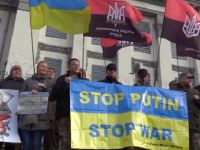 Kiev’de bir grup aktivist Rusya Büyükelçiliği’nin önünde Halep’te sivillere yönelik saldırıları protesto etti.