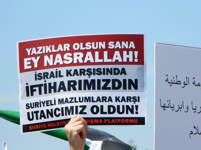 Murat Ayar’ın sunumunu yaptığı eylemde “Katil Esed ve İşbirlikçileri; Banyas’tan, Reyhanlı’ya Döktüğünüz Kanların Hesabını Vereceksiniz!”, “Baas Rejimi ve İşbirlikçisi HizbulEsed’e Karşı, Kusayr’da Direnen Mücahitlerin Yanındayız!”, “Baasın Safında Duranlar, Ümmetle Aynı Safta Olamazlar!”, “Yaşasın Suriye Direnişimiz!” yazılı pankartlar açılırken “Yazıklar Olsun Sana Ey Nasrallah, İsrail Karşısında İftiharımızdın, Suriyeli Mazlumlara Karşı Utancımız Oldun!”, “Baas Zulmüne ve HizbulEsed İhanetine Karşı, Kusayr’da Direnen Mücahitlere Bin Selam!”, “Suriye İslami Direnişle Özgürleşecek!”, “Sessiz Kalmak Baas’ın Suçuna Ortak Olmaktır!”, “Baas Çöplüğe Esed Sehpaya!”, “Esed Canavarını Durdurun!” yazılı dövizler taşındı.