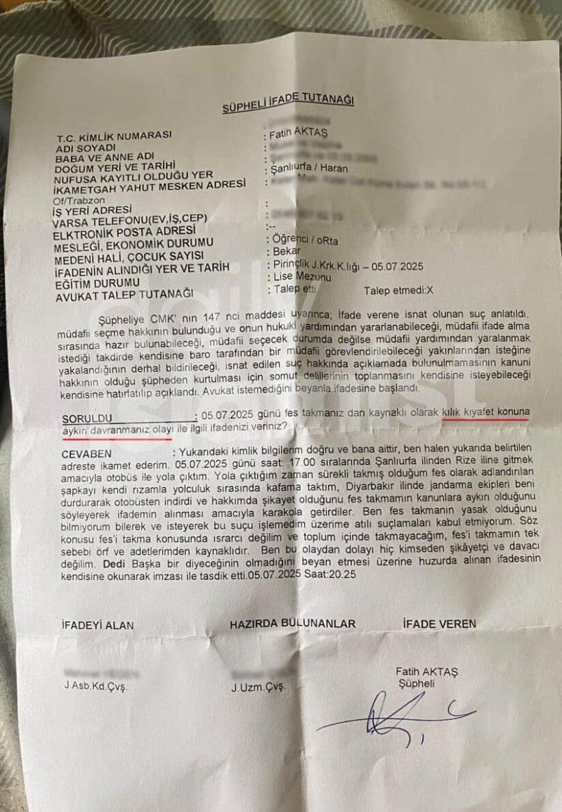 Şanlıurfa’dan Rize’ye otobüsle seyahat eden Fatih Aktaş isimli bir genç yolculuk sırasında başına fes takınca başka bir yolcu tarafından şikayet edildi.