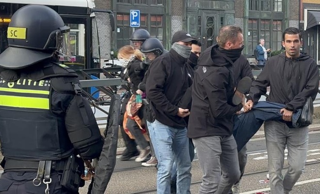 Hollanda'nın başkenti Amsterdam'da, Filistin yanlısı göstericiler ile polis arasında yaşanan gerginlik sonucu çok sayıda kişi gözaltına alındı.