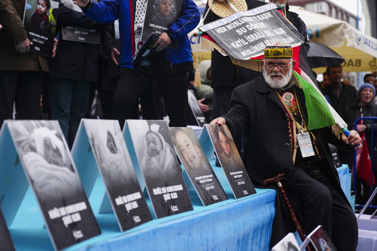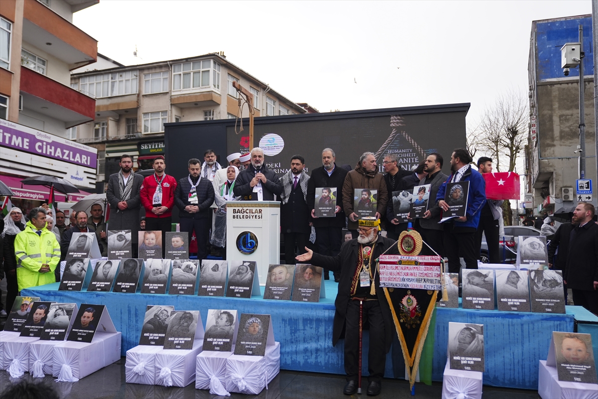 Gazze'de öldürülen çocuklara dikkati çekmek amacıyla platforma temsili kefene sarılı çocuk tabutları bırakılan eylemde, Müslümanlar için dua edildi.