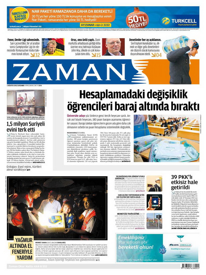 Gazete Manşetleri - 1 Ağustos 2012