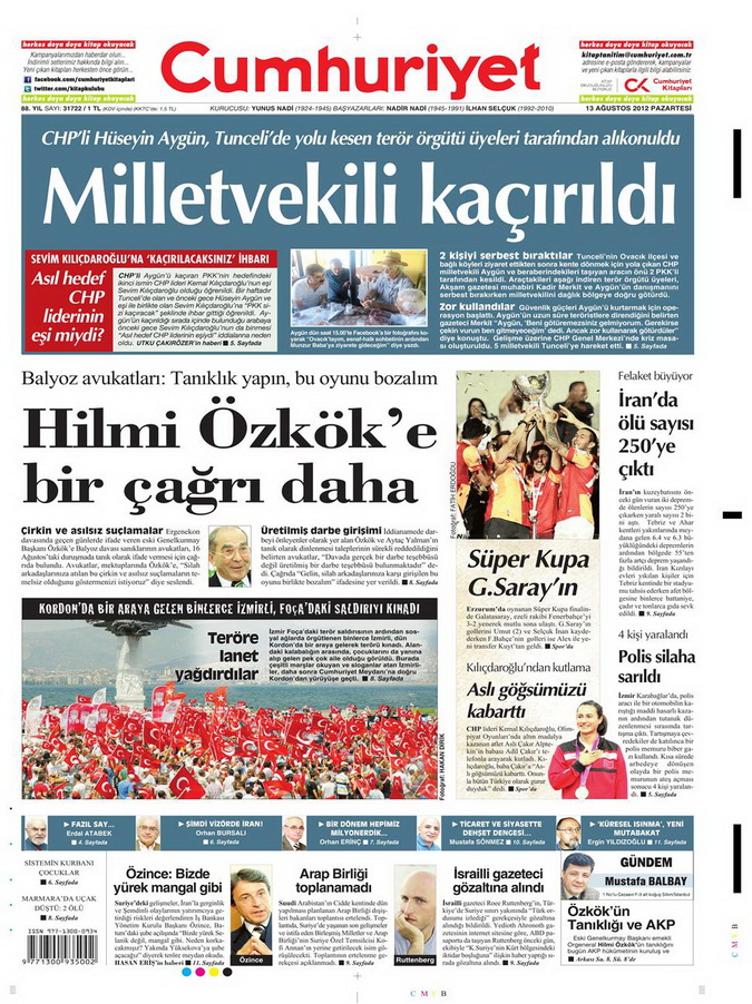 Gazete Manşetleri - 13 Ağustos 2012 Pazartesi