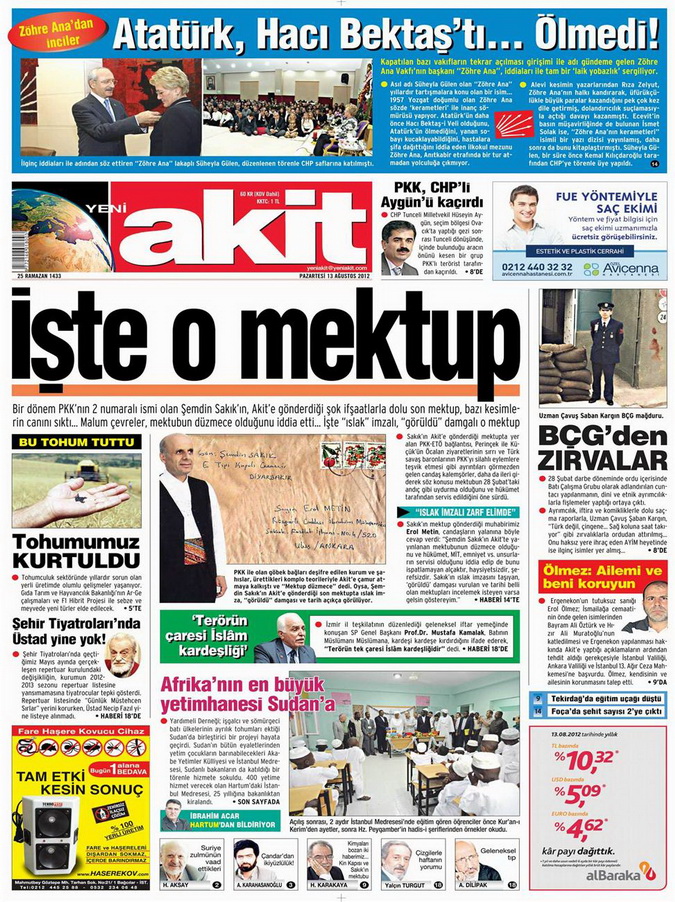 Gazete Manşetleri - 13 Ağustos 2012 Pazartesi