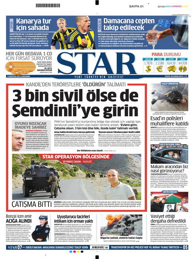 Gazete Manşetleri - 8 Ağustos 2012 Çarşamba