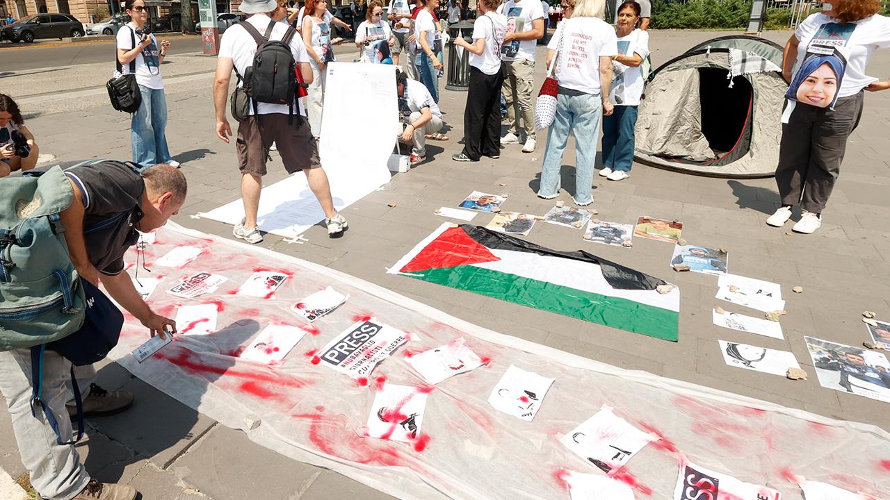Üzerinde "Basın (Press)" yazan sahadaki basın emekçilerinin hedef alınmaması, aksine korunması gerektiği vurgulanan gösteride, Gazze'de yaşananların, İsrail saldırılarında ölen 200'ü aşkın gazeteci sayesinde öğrenildiği belirtildi.