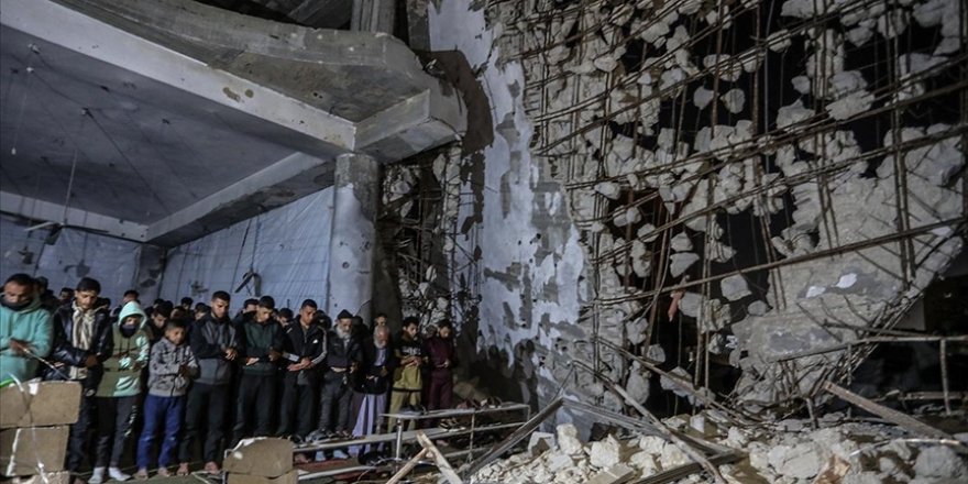 Gazze Şeridi'nin en büyük ve en eski camisi olarak bilinen "Büyük Ömeri" başta olmak üzere İsrail saldırılarında yıkılan camilerin enkazı arasında saf tutan Filistinliler, hep birlikte tekbirler eşliğinde teravih namazını kıldı.