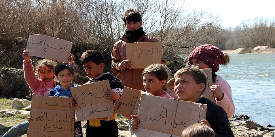 Edirne'ye gelen göçmenlerin sınırdaki bekleyişi sürerken, Meriç Nehri'nin kıyısındaki Doyran köyünde göçmen çocuklar, Türkçe, İngilizce ve Arapça "sınırları açın" yazılı pankart açarak gösteri yaptı.